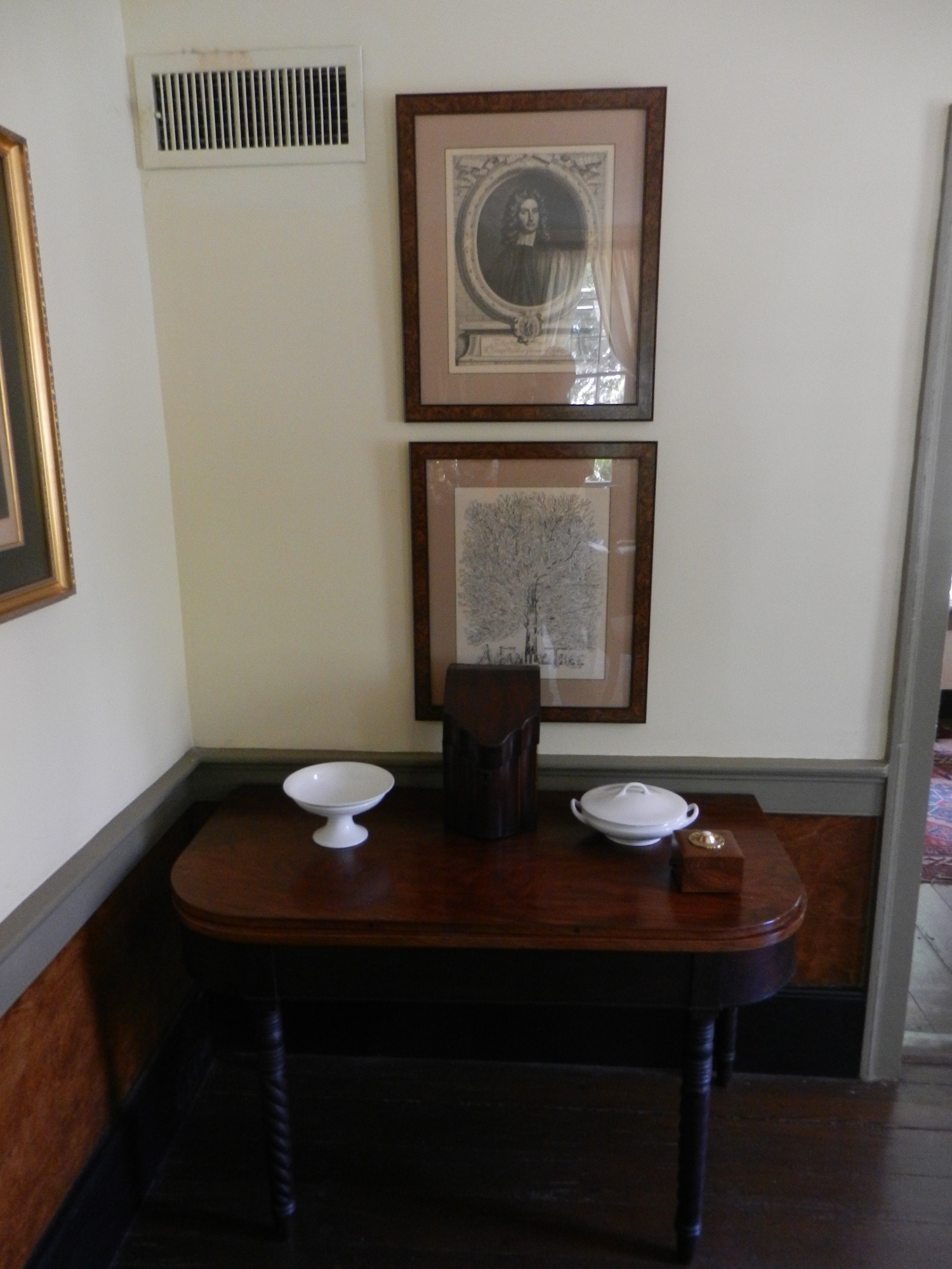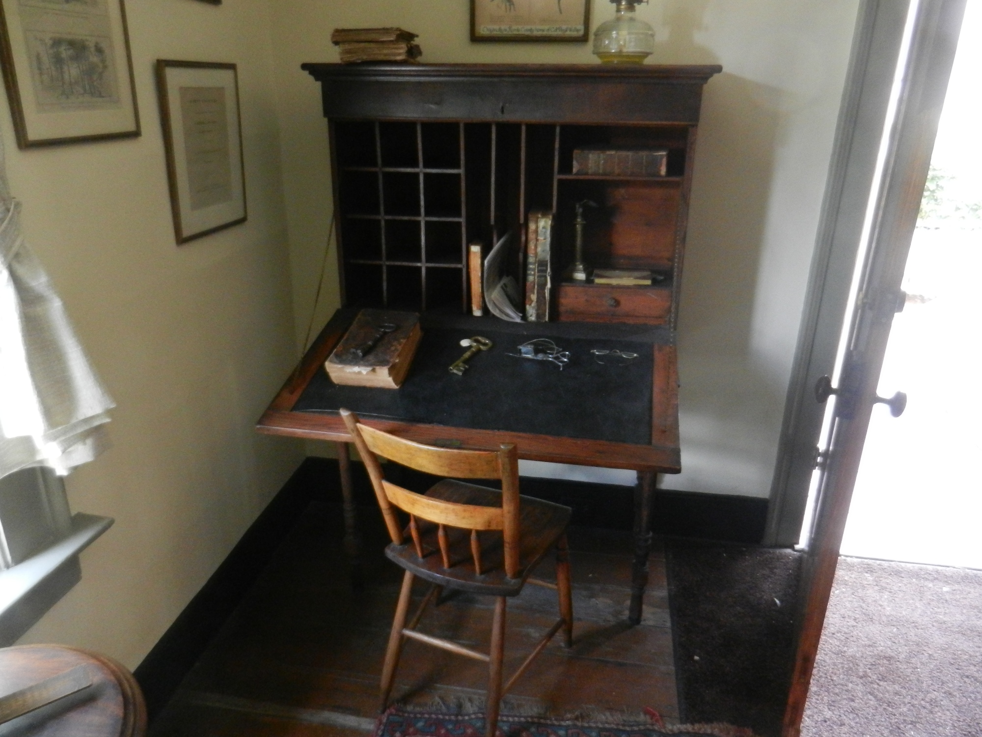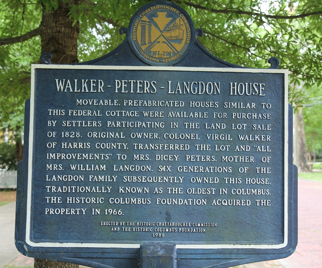 Walker-Peters-Langdon House in Columbus Georgia Links back to the Walker Family page Virgil Homer Walker built a "town house" in Columbus, GA, that was either intended to be used when the family was in Columbus on business, or he built this as a business investment. The Walker plantation in Harris county was about 20 miles away, a days' travel in the 1830's. The house is described as a "prefabricated house" that was moved on to the town lot. This house is on the National Registry of Historic Sites, and is considered the oldest house in Columbus. The house is a museum, operated by the Columbus HistoricFoundation, and tours can be arranged. There is a little "Walker-Peters" controversy regarding the house, as it may be that the Walker's never lived in the house. Two of Virgil's siblings, John Thacker Walker (b. 1806, a Columbus magistrate) and Dr. Austin Martin Walker (b. 1812, physician) lived in Columbus, so he may have stayed with them when he was in town, or he may have had another house besides this one. One theory, relayed by museum documents and tour narrative: Columbus was founded in 1828 after the Creek Indian removal, and Virgil Walker bought three town lots in 1828 as investments. Once the pre-fabricated house was built on this lot, and perhaps before it was completely finished, the Nathaniel Peters family moved in to it, although Virgil retained the deed until 1836. It is thought that Nathaniel Peters and Virgil Walker were close friends, as they may have served together in the Seminole Indian Wars, and the Peter's may have also had land north of Columbus, perhaps near the Walkers' plantation. It is speculated that perhaps Virgil was in business with others unknown to build the pre-fabricated houses during the early boom-town days of Columbus. It is stated elsewhere that the Walkers trained slaves to be skilled artisans (ref 3), and that they produced all the materials for building the plantation homes. Since there were vast natural resources on the Walker plantation, including pine forests that would need to be cleared for farmland, perhaps resulting in lumber for building, and the ability to produce bricks, the Walker's may have been using their natural and human resources to build the pre-fabricated houses, and the Walker-Peters-Langdon house may have been a "model home". Additional evidence lends credence to this theory. The house is located a few blocks south of downtown Columbus, in the historical district, but it is the only house in the district that was original. Other, more elaborate, houses in the district were moved in from other areas in Columbus. It is thought that the block where the house is located was originally built out with pre-fabricated houses, like the Walker-Peters-Langdon house. However, the Walker-Peters-Langdon house differs from all the other pre-fabricated houses, as it had a basement in which it had a "winter kitchen" (because it helped heat the house in the winter). This is a kitchen built in the basement, with two cooking hearths, one at each end of the house, one high temperature and one low temperature. At that time, most houses had kitchens in a separate building to protect the house from the open hearth fires. According to the tour guide, the Walker house is the only house in Columbus with a kitchen in the basement. Interestingly enough, it is the same winter kitchen set-up as Virgil Walker's plantation house, with the exception that the plantation house also had a "summer kitchen" that was a detached building (subsequently connected to the house, still evident today on the right side in this photo)). Although he may have never lived in the house, some of the furnishings in the house did belong to Virgil, including his desk, his traveling trunk, a portrait of his wife Ann champion (Bell) Walker, and a botanical card. As a museum, the house is filled with period decor. also on the wall in one of the rooms is the Walker Family Tree (this sure gets around!), and an engraving of George Walker, Governor of Londonderry, whom some believe is an ancestor of Virgil's great-grandfather George (as yet unsubstantiated). In Virgil's will, he is passing a couple of Columbus lots off to his offspring. Research of the wills, tracking down the lot numbers, may indicate who received the other lots upon his death.