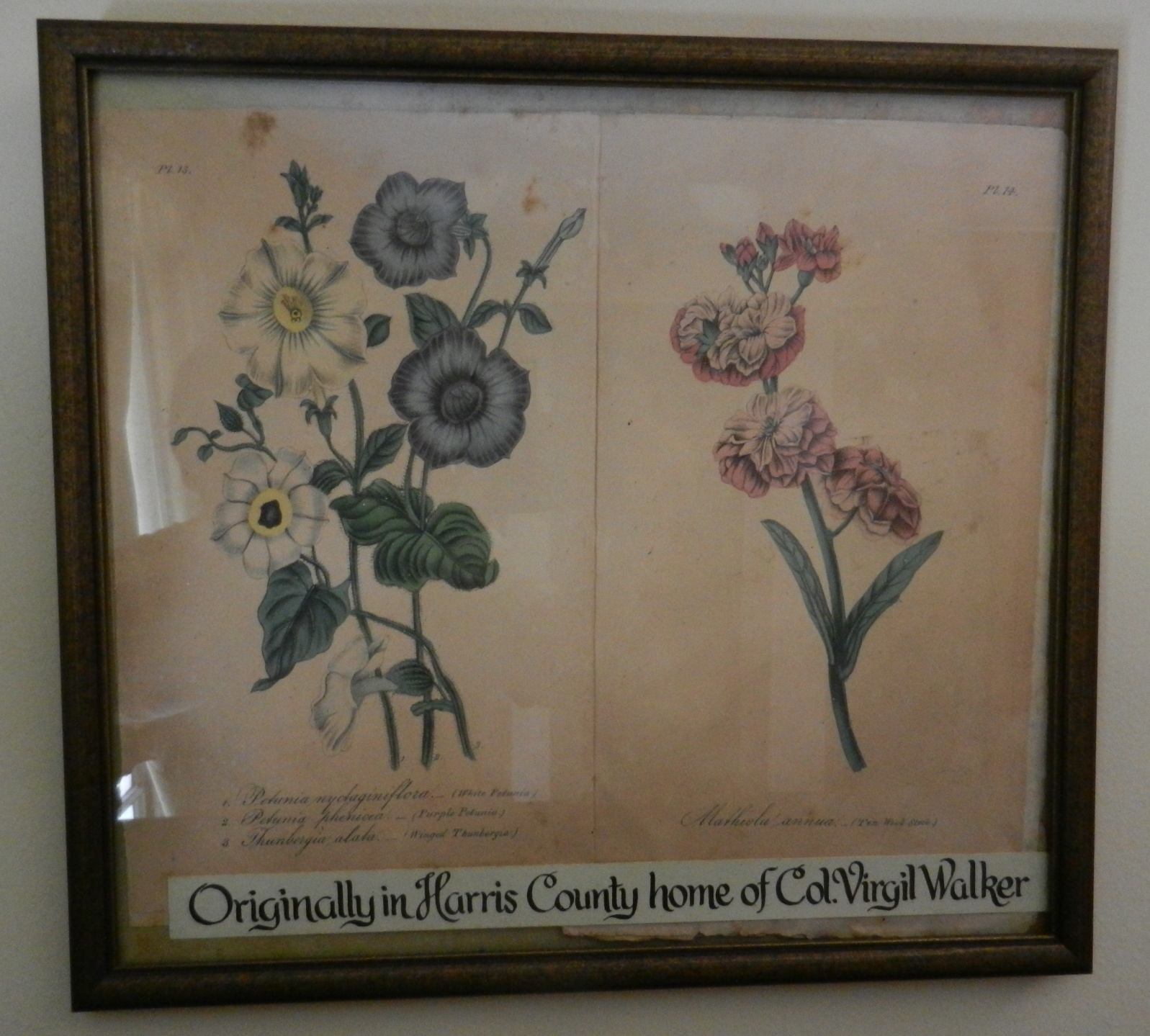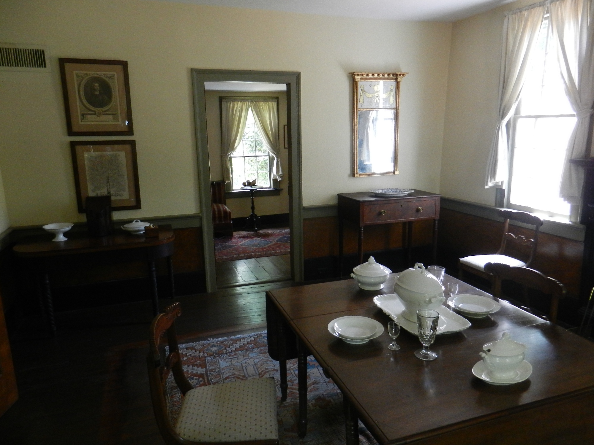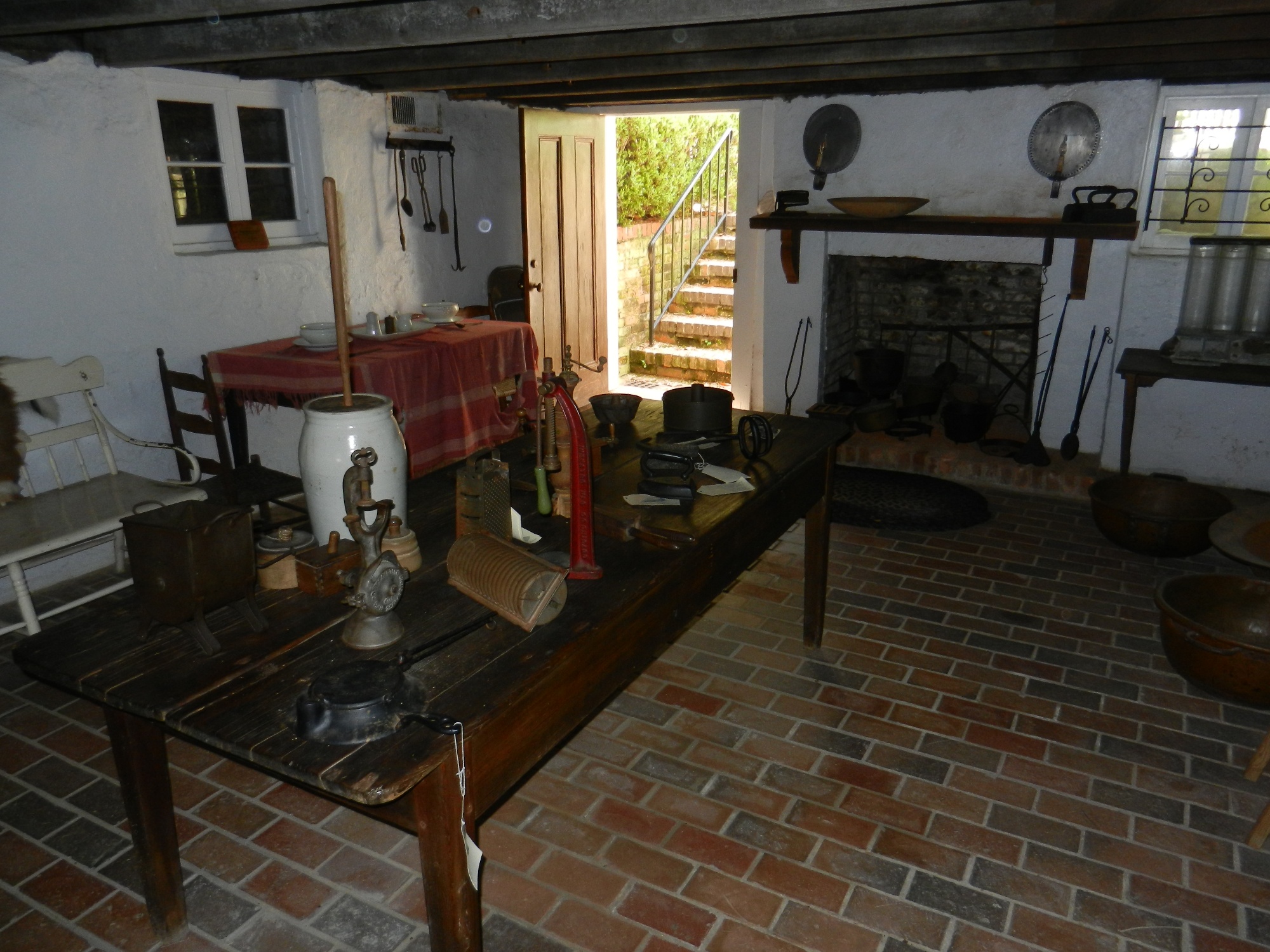 Walker-Peters-Langdon House in Columbus Georgia Links back to the Walker Family page Virgil Homer Walker built a "town house" in Columbus, GA, that was either intended to be used when the family was in Columbus on business, or he built this as a business investment. The Walker plantation in Harris county was about 20 miles away, a days' travel in the 1830's. The house is described as a "prefabricated house" that was moved on to the town lot. This house is on the National Registry of Historic Sites, and is considered the oldest house in Columbus. The house is a museum, operated by the Columbus HistoricFoundation, and tours can be arranged. There is a little "Walker-Peters" controversy regarding the house, as it may be that the Walker's never lived in the house. Two of Virgil's siblings, John Thacker Walker (b. 1806, a Columbus magistrate) and Dr. Austin Martin Walker (b. 1812, physician) lived in Columbus, so he may have stayed with them when he was in town, or he may have had another house besides this one. One theory, relayed by museum documents and tour narrative: Columbus was founded in 1828 after the Creek Indian removal, and Virgil Walker bought three town lots in 1828 as investments. Once the pre-fabricated house was built on this lot, and perhaps before it was completely finished, the Nathaniel Peters family moved in to it, although Virgil retained the deed until 1836. It is thought that Nathaniel Peters and Virgil Walker were close friends, as they may have served together in the Seminole Indian Wars, and the Peter's may have also had land north of Columbus, perhaps near the Walkers' plantation. It is speculated that perhaps Virgil was in business with others unknown to build the pre-fabricated houses during the early boom-town days of Columbus. It is stated elsewhere that the Walkers trained slaves to be skilled artisans (ref 3), and that they produced all the materials for building the plantation homes. Since there were vast natural resources on the Walker plantation, including pine forests that would need to be cleared for farmland, perhaps resulting in lumber for building, and the ability to produce bricks, the Walker's may have been using their natural and human resources to build the pre-fabricated houses, and the Walker-Peters-Langdon house may have been a "model home". Additional evidence lends credence to this theory. The house is located a few blocks south of downtown Columbus, in the historical district, but it is the only house in the district that was original. Other, more elaborate, houses in the district were moved in from other areas in Columbus. It is thought that the block where the house is located was originally built out with pre-fabricated houses, like the Walker-Peters-Langdon house. However, the Walker-Peters-Langdon house differs from all the other pre-fabricated houses, as it had a basement in which it had a "winter kitchen" (because it helped heat the house in the winter). This is a kitchen built in the basement, with two cooking hearths, one at each end of the house, one high temperature and one low temperature. At that time, most houses had kitchens in a separate building to protect the house from the open hearth fires. According to the tour guide, the Walker house is the only house in Columbus with a kitchen in the basement. Interestingly enough, it is the same winter kitchen set-up as Virgil Walker's plantation house, with the exception that the plantation house also had a "summer kitchen" that was a detached building (subsequently connected to the house, still evident today on the right side in this photo)). Although he may have never lived in the house, some of the furnishings in the house did belong to Virgil, including his desk, his traveling trunk, a portrait of his wife Ann champion (Bell) Walker, and a botanical card. As a museum, the house is filled with period decor. also on the wall in one of the rooms is the Walker Family Tree (this sure gets around!), and an engraving of George Walker, Governor of Londonderry, whom some believe is an ancestor of Virgil's great-grandfather George (as yet unsubstantiated). In Virgil's will, he is passing a couple of Columbus lots off to his offspring. Research of the wills, tracking down the lot numbers, may indicate who received the other lots upon his death.